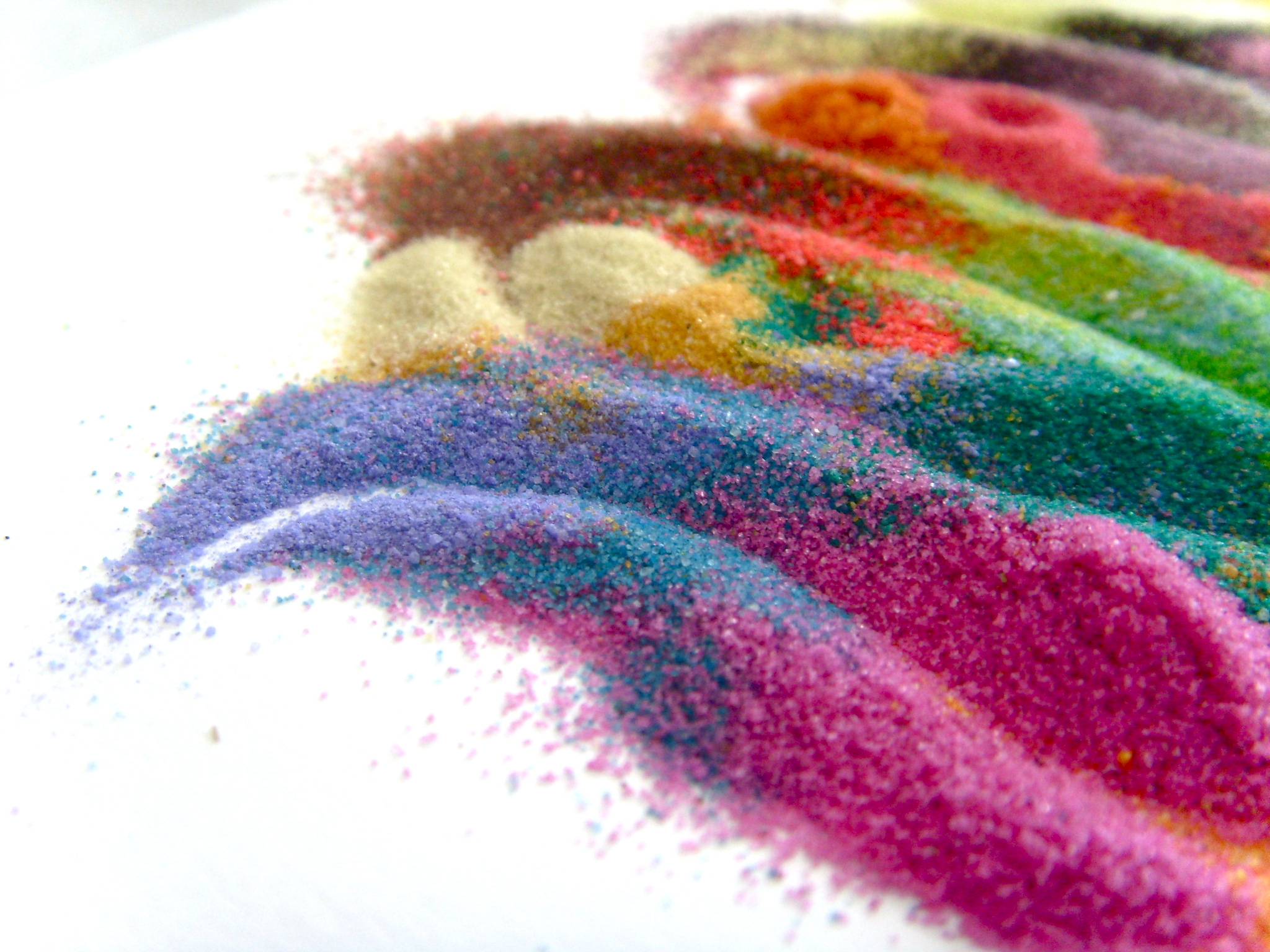 Otra opción muy buena es utilizar sal fina en lugar de arena. Al ser blanca, los colores quedan muy puros. Además, como es comestible, si se combina con colorantes alimentarios, es apta para niños/as pequeños. Pero tiene dos inconvenientes. Primero, que se disuelve en agua y por lo tanto no va bien para según que usos queramos dar a la arena de colores. Segundo, que un exceso de sal es dañino para las plantas y, por eso, esta arena no se podría utilizar para decorar una maceta o en un jardín. Además, como hemos dicho, se disuelve en agua y al regar la maceta se disolvería.